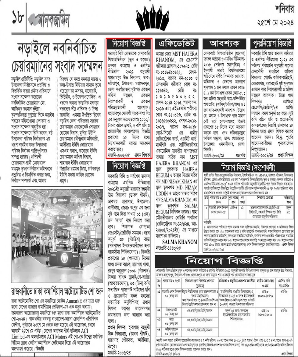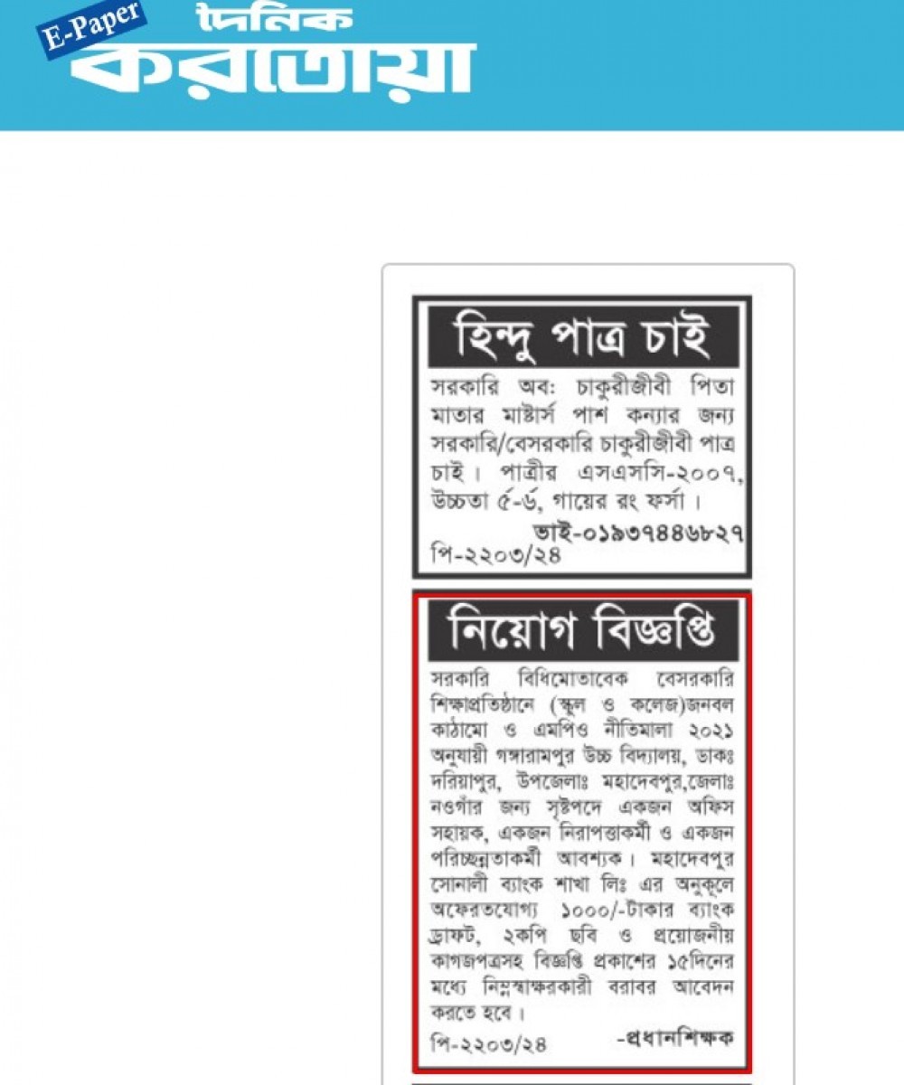 | অফিস সহায়ক,নিরাপত্তা কর্মী ও পরিচ্ছন্নতাকর্মী পদে নিয়োগ বিজ্ঞপ্তি প্রকাশ-( দৈনিক করতোয়া)২৫/০৫/২০২৪ | ২৫-০৫-২০২৪ | বিস্তারিত | ডাউনলোড |